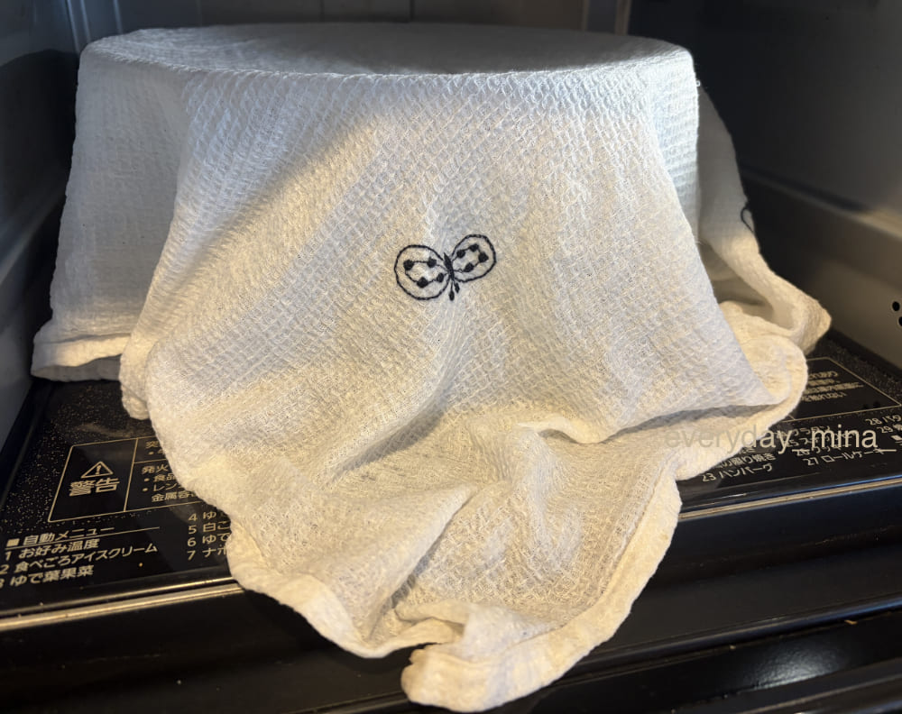 元のボウルに入れて、ラップ、濡れ布巾をしたら