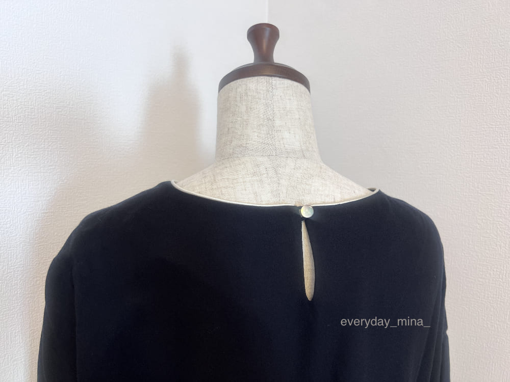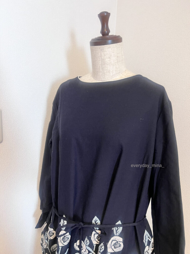 着る前は「刺繍の重みでお肉を拾ってしまうかな?」と少し不安になりながら試着したのですが、袖を通してみて驚きました。実際にはそんな心配は全くなく、ストンと綺麗に落ちるシルエットが体を包み込んでくれるんです。