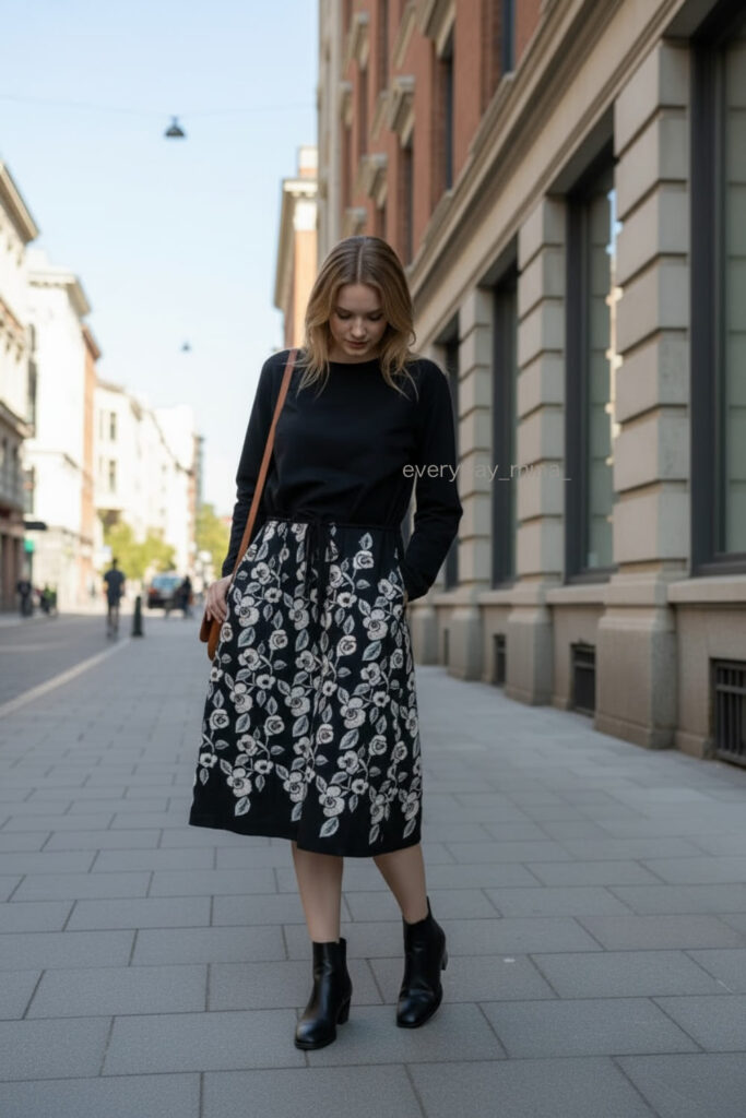 ブラウンのバッグとレザーのブーツで少し引き締めると垢抜けます。