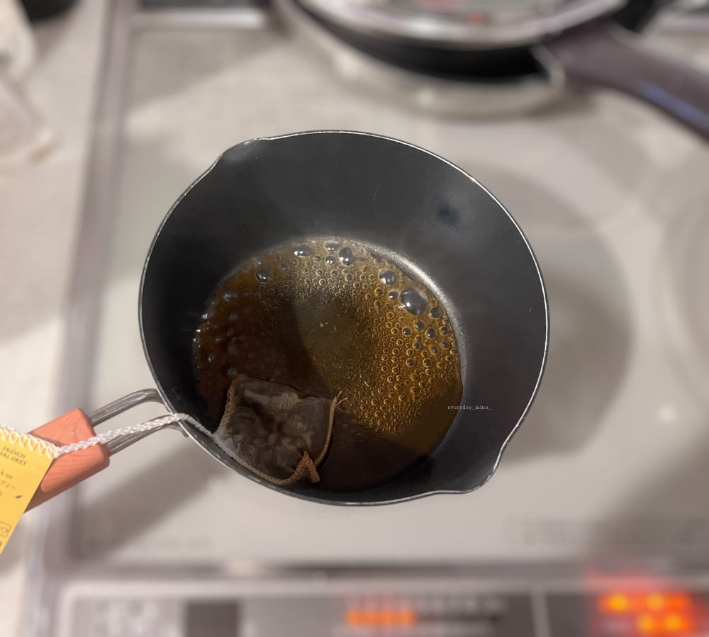 まずは少なめのお湯(100ml程度)で、ティーバッグの紅茶をしっかりと濃く抽出します。ここで土台となる香りを引き出すのがコツ。