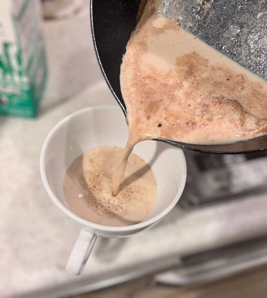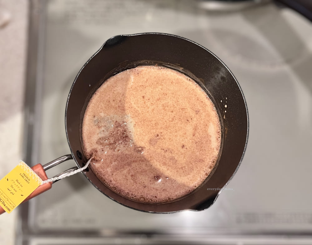 牛乳(180ml)を注ぎます。ここで沸騰には要注意! ぐつぐつさせてしまうと、ミルクに膜が張って口当たりが少し残念になってしまいます。弱火で「ふつふつ」としてきたらOKです。