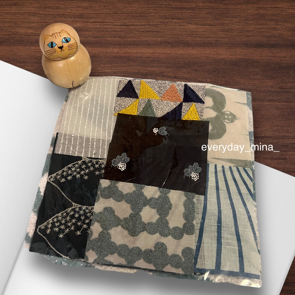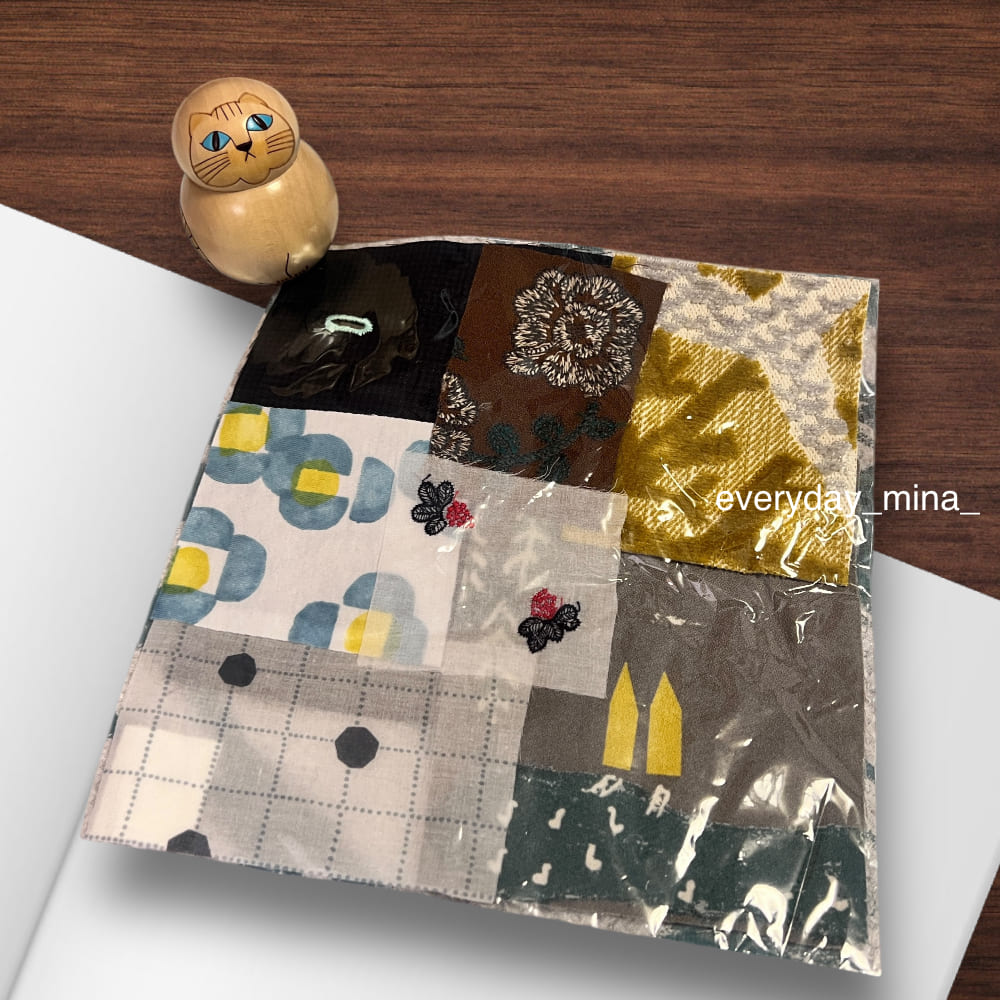 パッケージのサイズは約22.5cm×22.5cm。中には大小あわせて7枚ほどのハギレが、色のトーンを合わせて美しくパッキングされています。